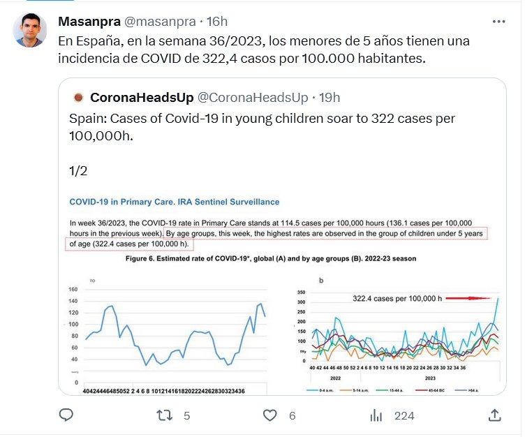 LESA HUMANIDAD En España, en la semana 36/2023, los menores de 5 años tienen una incidencia de COVID de 322,4 casos por 100.000 habitantes. Posted on septiembre 18, 2023 por coronado