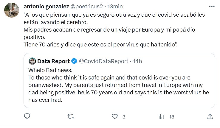 TESTIMONIOS «A los que piensan que ya es seguro otra vez y que el covid se acabó les están lavando el cerebro. Mis padres acaban de regresar de un viaje por Europa y mi papá dio positivo. Tiene 70 años y dice que este es el peor virus que ha tenido».