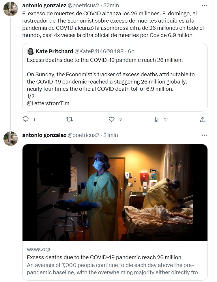 El exceso de muertes de COV1D alcanza los 26 millones. El domingo, el rastreador de The Economist sobre exceso de muertes atribuibles a la pandemia de COV1D alcanzó la asombrosa cifra de 26 millones en todo el mundo, casi 4x veces la cifra oficial de muertes por Cov de 6,9 millon
