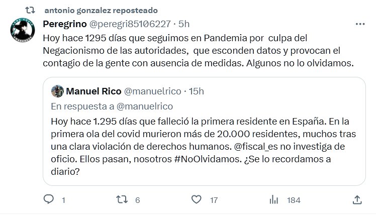 Hoy hace 1295 días que seguimos en Pandemia por culpa del Negacionismo de las autoridades, que esconden datos y provocan el contagio de la gente con ausencia de medidas. Algunos no lo olvidamos.