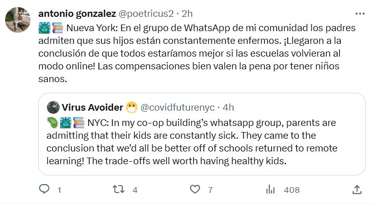 TESTIMONIOS 🗽📚 Nueva York: En el grupo de WhatsApp de mi comunidad los padres admiten que sus hijos están constantemente enfermos. ¡Llegaron a la conclusión de que todos estaríamos mejor si las escuelas volvieran al modo online! Las compensaciones bien valen la pena por tener niños sanos.