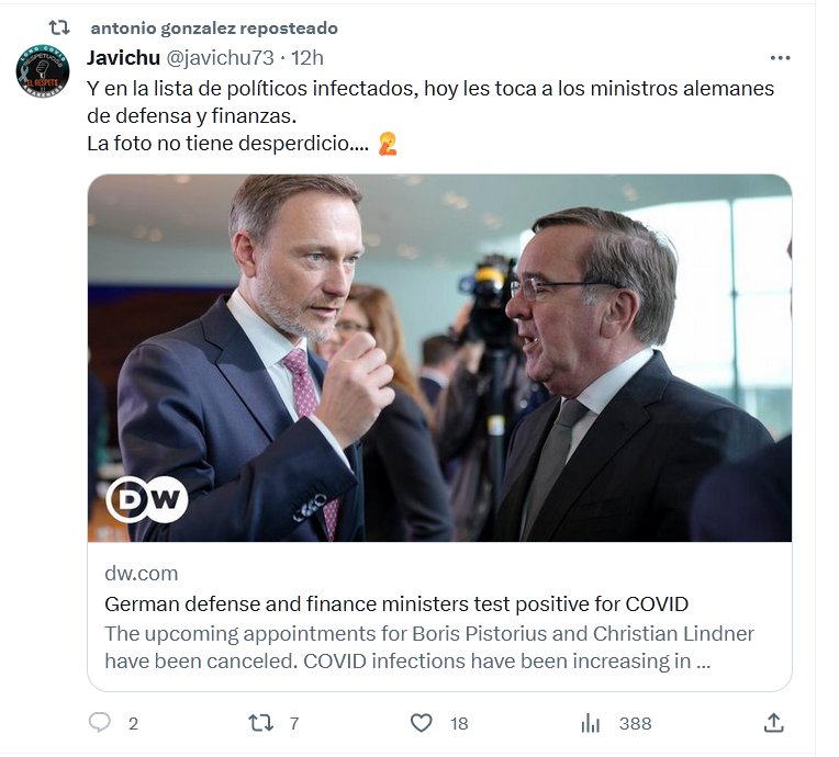 Y en la lista de políticos infectados, hoy les toca a los ministros alemanes de defensa y finanzas. Posted on septiembre 19, 2023 por coronado