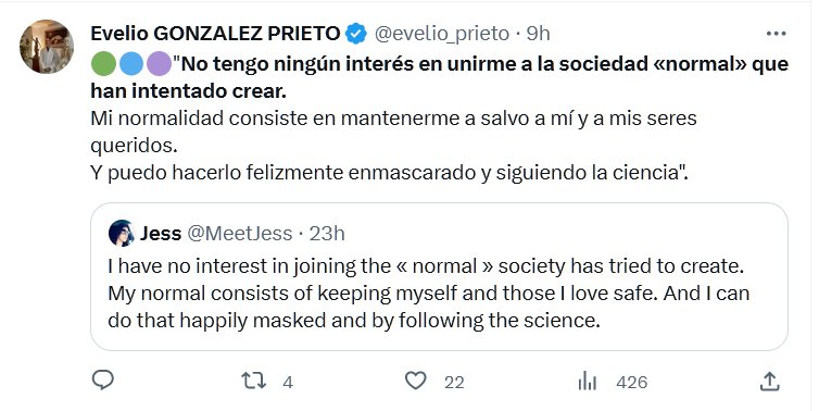 🟢🔵🟣»No tengo ningún interés en unirme a la sociedad «normal» que han intentado crear. Mi normalidad consiste en mantenerme a salvo a mí y a mis seres queridos. Y puedo hacerlo felizmente enmascarado y siguiendo la ciencia».