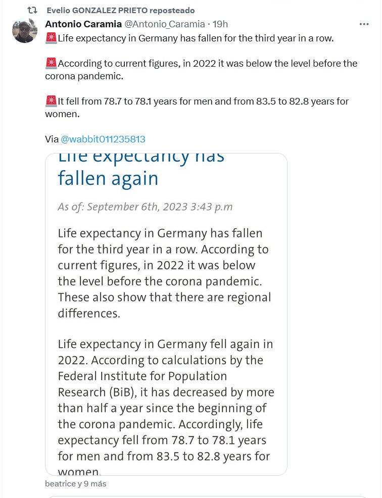 EN INGLÉS 🚨La esperanza de vida en Alemania ha disminuido por tercer año consecutivo. 🚨Según las cifras actuales, en 2022 estuvo por debajo del nivel anterior a la pandemia del coronavirus. 🚨Bajó de 78,7 a 78,1 años para los hombres y de 83,5 a 82,8 años para las mujeres.