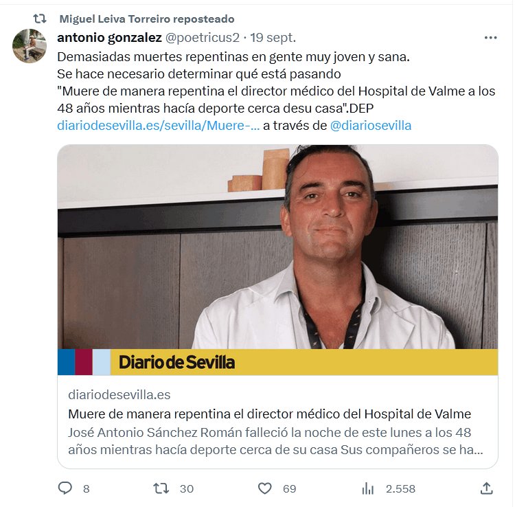 NODIGASQUEESCOVID HACE ESTRAGOS Demasiadas muertes repentinas en gente muy joven y sana. Se hace necesario determinar qué está pasando «Muere de manera repentina el director médico del Hospital de Valme a los 48 años mientras hacía deporte cerca desu casa».DEP