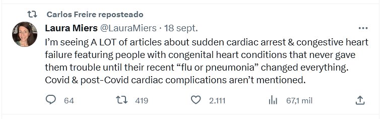 NODIGASQUEESCOVID HACE ESTRAGOS (EN INGLÉS) Veo MUCHOS artículos sobre paro cardíaco repentino e insuficiencia cardíaca congestiva que presentan a personas con afecciones cardíacas congénitas que nunca les causaron problemas hasta que su reciente “gripe o neumonía” lo cambió todo. No se mencionan las complicaciones cardíacas de Covid y post-Covid.