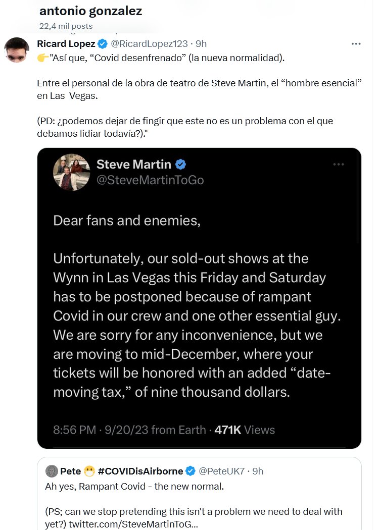 👉»Así que, “Covid desenfrenado” (la nueva normalidad). Entre el personal de la obra de teatro de Steve Martin, el “hombre esencial” en Las Vegas. (PD: ¿podemos dejar de fingir que este no es un problema con el que debamos lidiar todavía?).»