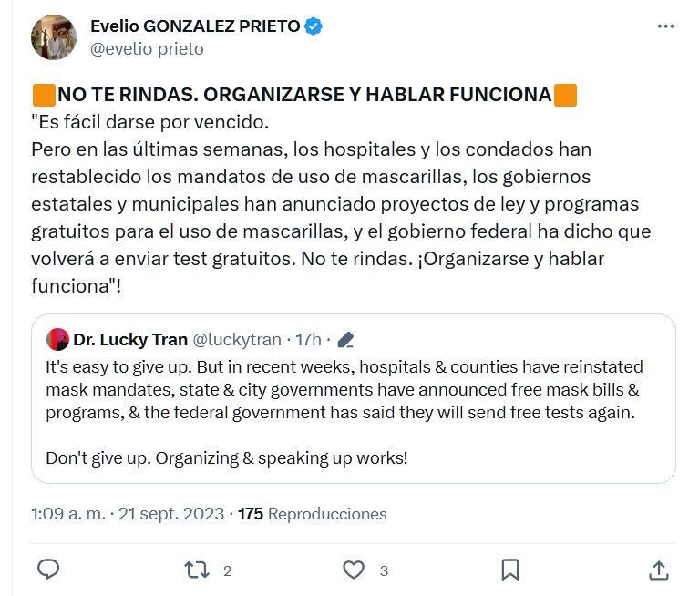 «Es fácil darse por vencido. Pero en las últimas semanas, los hospitales y los condados han restablecido los mandatos de uso de mascarillas, los gobiernos estatales y municipales han anunciado proyectos de ley y programas gratuitos para el uso de mascarillas, y el gobierno federal ha dicho que volverá a enviar test gratuitos. No te rindas. ¡Organizarse y hablar funciona»!