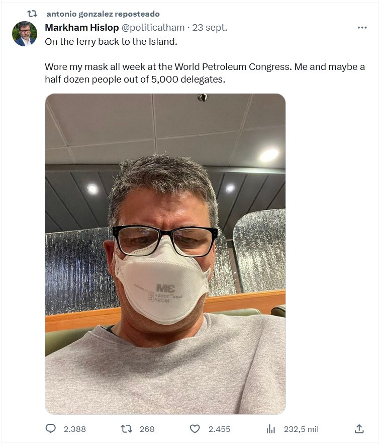 LA GENTE MÁS INTELIGENTE DEL MUNDO USA MASCARILLA: TESTIMONIOS En el ferry de regreso a la isla. Usé mi máscara toda la semana en el Congreso Mundial del Petróleo. Yo y tal vez media docena de personas de 5.000 delegados.