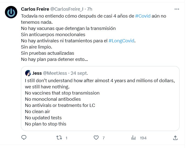 LO INSTALARON COMO AL SIDA Todavía no entiendo cómo después de casi 4 años de #Covid aún no tenemos nada. No hay vacunas que detengan la transmisión Sin anticuerpos monoclonales No hay antivirales ni tratamientos para el #LongCovid. Sin aire limpio. Sin pruebas actualizadas No hay plan para detener esto…