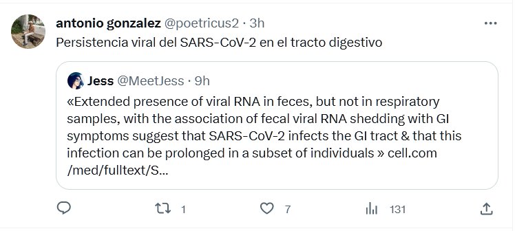 «La presencia prolongada de ARN viral en las heces, pero no en muestras respiratorias, con la asociación de la eliminación de ARN viral fecal con síntomas gastrointestinales, sugiere que el SARS-CoV-2 infecta el tracto gastrointestinal y que esta infección puede prolongarse en un subconjunto de individuos»