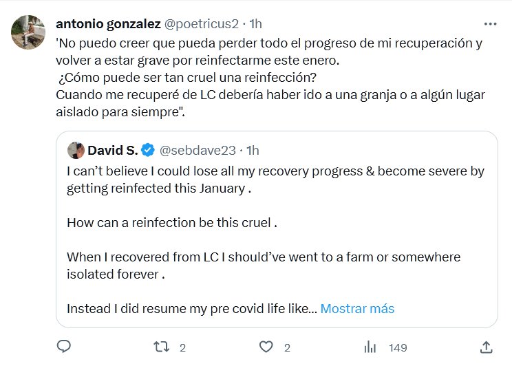 TESTIMONIOS ‘No puedo creer que pueda perder todo el progreso de mi recuperación y volver a estar grave por reinfectarme este enero. ¿Cómo puede ser tan cruel una reinfección? Cuando me recuperé de LC (LONGCOVID) debería haber ido a una granja o a algún lugar aislado para siempre».