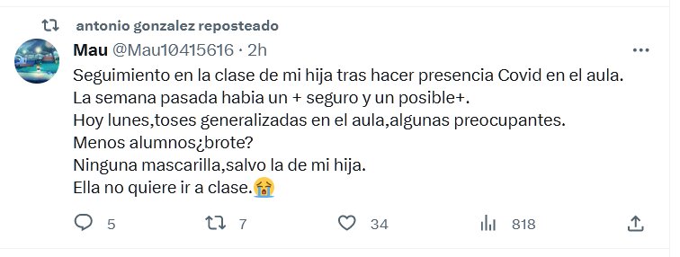 TESTIMONIOS Seguimiento en la clase de mi hija tras hacer presencia Covid en el aula. La semana pasada habia un + (POSITIVO) seguro y un posible+ (POSITIVO). Hoy lunes,toses generalizadas en el aula,algunas preocupantes. Menos alumnos¿brote? Ninguna mascarilla,salvo la de mi hija. Ella no quiere ir a clase.😭