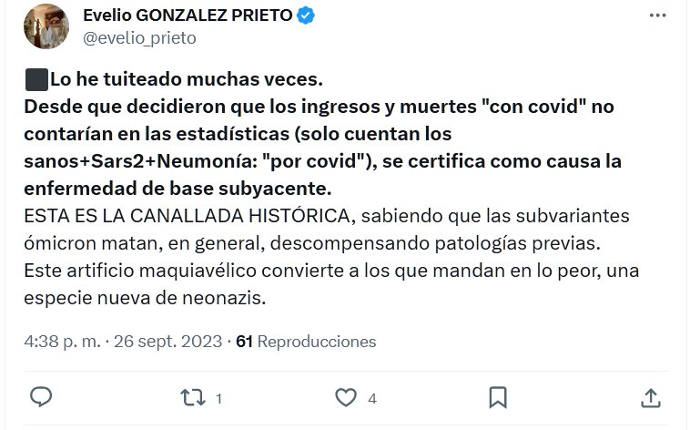 ⬛️Lo he tuiteado muchas veces. Desde que decidieron que los ingresos y muertes «con covid» no contarían en las estadísticas (solo cuentan los sanos+Sars2+Neumonía: «por covid»), se certifica como causa la enfermedad de base subyacente. ESTA ES LA CANALLADA HISTÓRICA, sabiendo que las subvariantes ómicron matan, en general, descompensando patologías previas. Este artificio maquiavélico convierte a los que mandan en lo peor, una especie nueva de neonazis