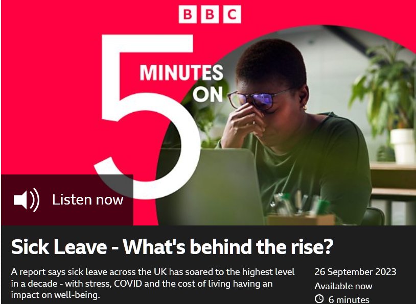 EN INGLÉS Baja por enfermedad: ¿qué hay detrás del aumento? 5 minutos encendido Un informe dice que las bajas por enfermedad en todo el Reino Unido se han disparado al nivel más alto en una década, y que el estrés, el COVID y el costo de vida tienen un impacto en el bienestar.
