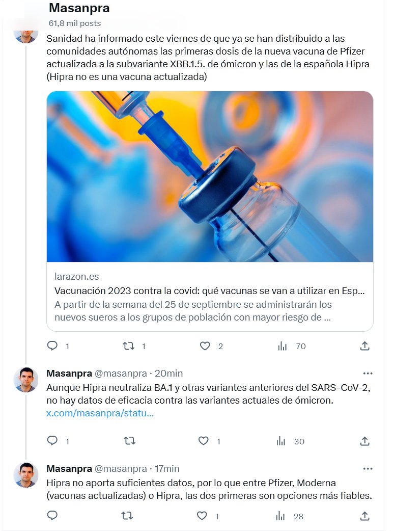 Sanidad ha informado este viernes de que ya se han distribuido a las comunidades autónomas las primeras dosis de la nueva vacuna de Pfizer actualizada a la subvariante XBB.1.5. de ómicron y las de la española Hipra (Hipra no es una vacuna actualizada)