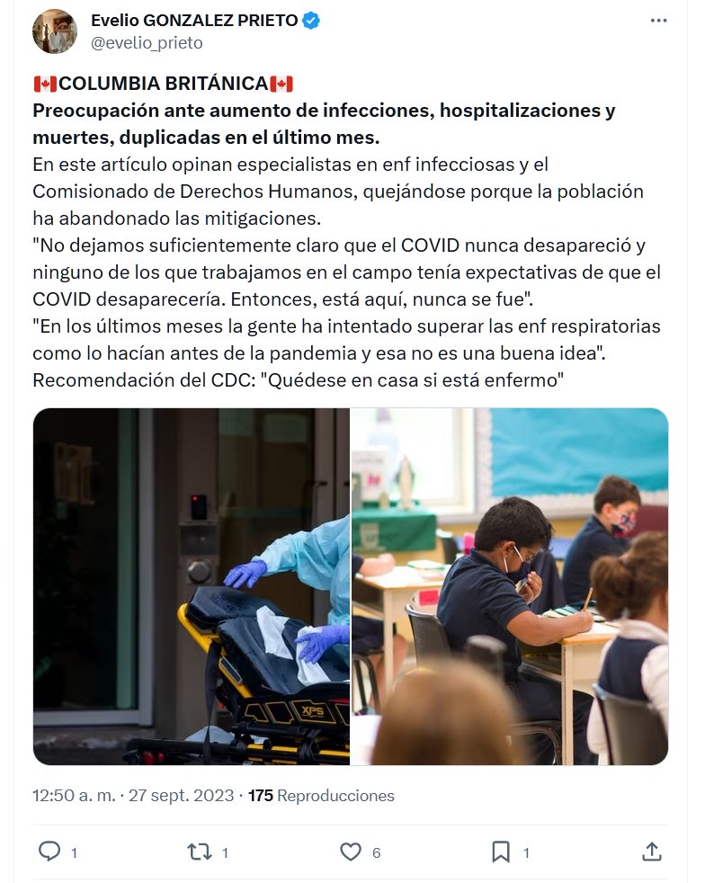🇨🇦COLUMBIA BRITÁNICA🇨🇦 Preocupación ante aumento de infecciones, hospitalizaciones y muertes, duplicadas en el último mes. «No dejamos suficientemente claro que el COVID nunca desapareció» Posted on septiembre 27, 2023 por coronado
