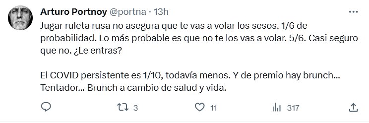 Jugar ruleta rusa no asegura que te vas a volar los sesos. 1/6 de probabilidad. Lo más probable es que no te los vas a volar. 5/6. Casi seguro que no. ¿Le entras? El COVID persistente es 1/10, todavía menos. Y de premio hay brunch… Tentador… Brunch a cambio de salud y vida.