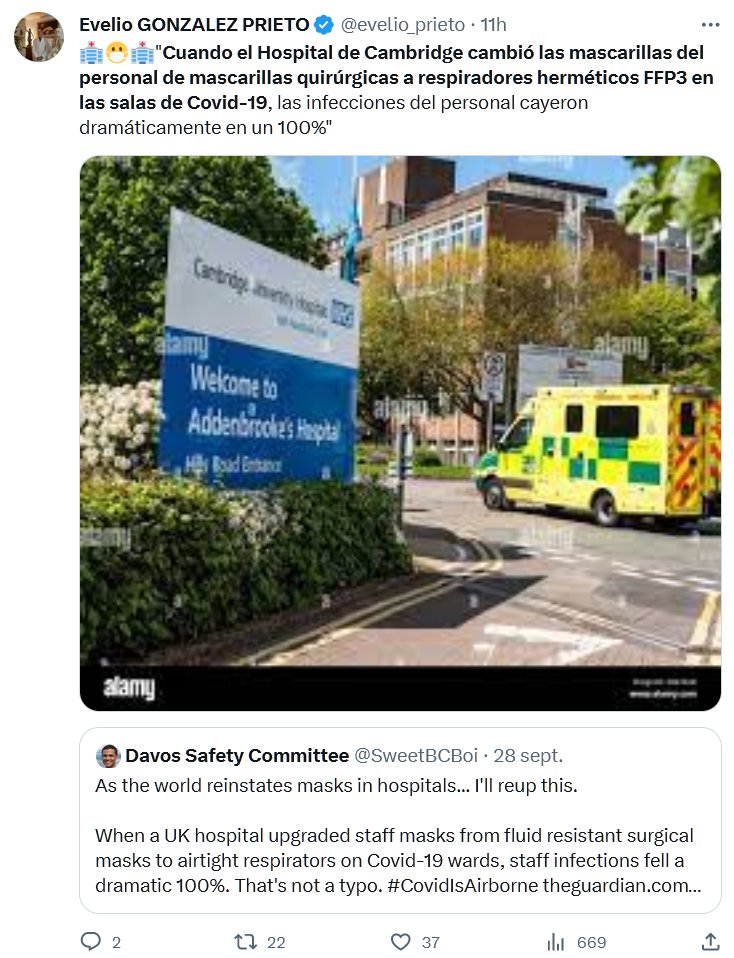 🏥😷🏥»Cuando el Hospital de Cambridge cambió las mascarillas del personal de mascarillas quirúrgicas a respiradores herméticos FFP3 en las salas de Covid-19, las infecciones del personal cayeron dramáticamente en un 100%»
