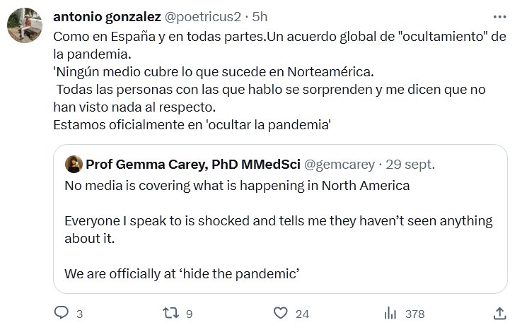 Como en España y en todas partes. Un acuerdo global de «ocultamiento» de la pandemia. ‘Ningún medio cubre lo que sucede en Norteamérica. Todas las personas con las que hablo se sorprenden y me dicen que no han visto nada al respecto. Estamos oficialmente en ‘ocultar la pandemia’