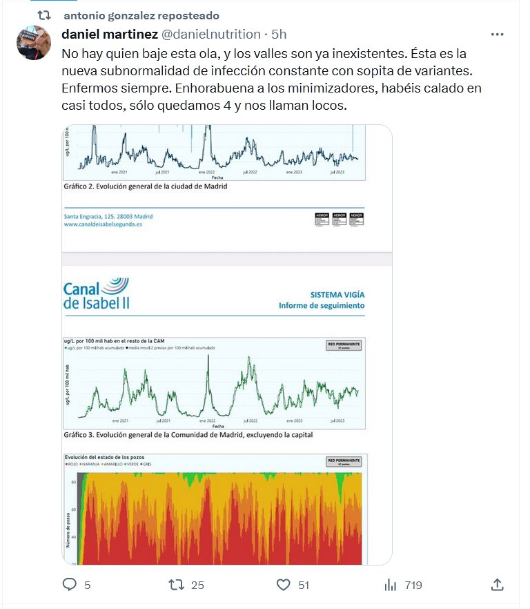 No hay quien baje esta ola, y los valles son ya inexistentes. Ésta es la nueva subnormalidad de infección constante con sopita de variantes. Enfermos siempre. Enhorabuena a los minimizadores, habéis calado en casi todos, sólo quedamos 4 y nos llaman locos.