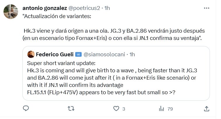 A UNA NUEVA VARIANTE DE UNA NUEVA PANDEMIA «Actualización de variantes: Hk.3 viene y dará origen a una ola. JG.3 y BA.2.86 vendrán justo después (en un escenario tipo Fornax+Eris) o con ella si JN.1 confirma su ventaja».