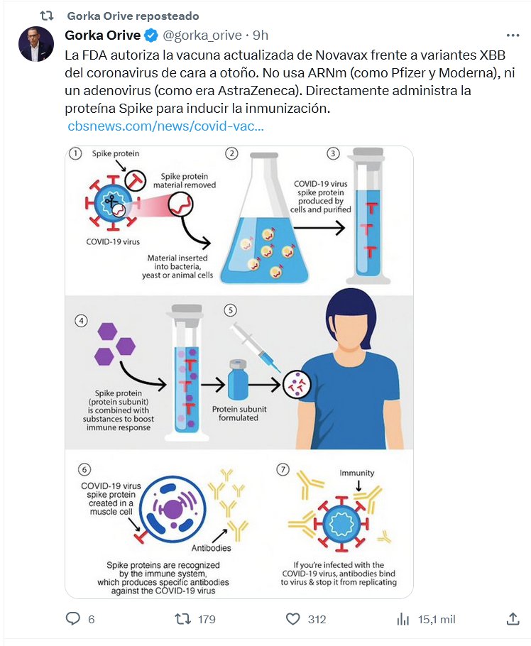La FDA autoriza la vacuna actualizada de Novavax frente a variantes XBB del coronavirus de cara a otoño. No usa ARNm (como Pfizer y Moderna), ni un adenovirus (como era AstraZeneca O SPUTNIK). Directamente administra la proteína Spike para inducir la inmunización.