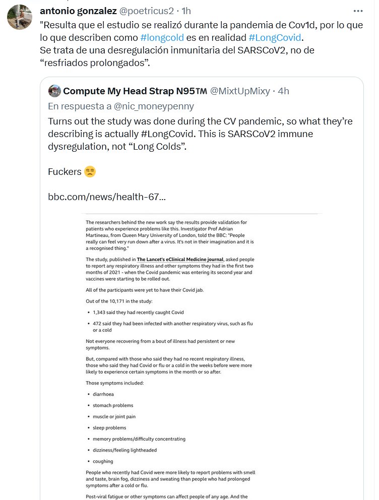 NO INVENTEN MÁS «Resulta que el estudio se realizó durante la pandemia de Covid, por lo que lo que describen como #longcold es en realidad #LongCovid. Se trata de una desregulación inmunitaria del SARSCoV2, no de “resfriados prolongados”.