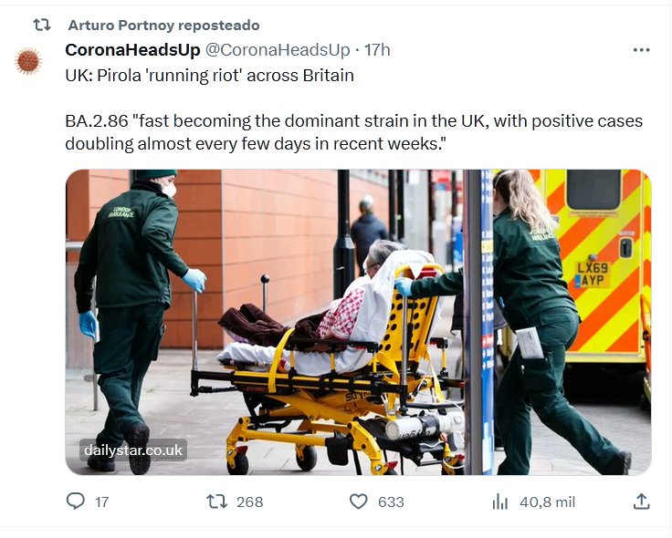 EN INGLÉS Reino Unido: Pirola ‘hace disturbios’ en Gran Bretaña BA.2.86 «se está convirtiendo rápidamente en la cepa dominante en el Reino Unido, y los casos positivos se han duplicado casi cada pocos días en las últimas semanas».