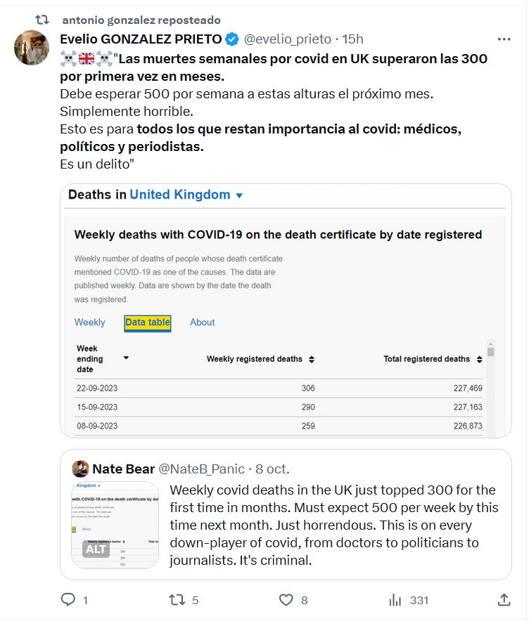 ☠️🇬🇧☠️»Las muertes semanales por covid en UK superaron las 300 por primera vez en meses. Debe esperar 500 por semana a estas alturas el próximo mes. Simplemente horrible. Esto es para todos los que restan importancia al covid: médicos, políticos y periodistas. Es un delito»