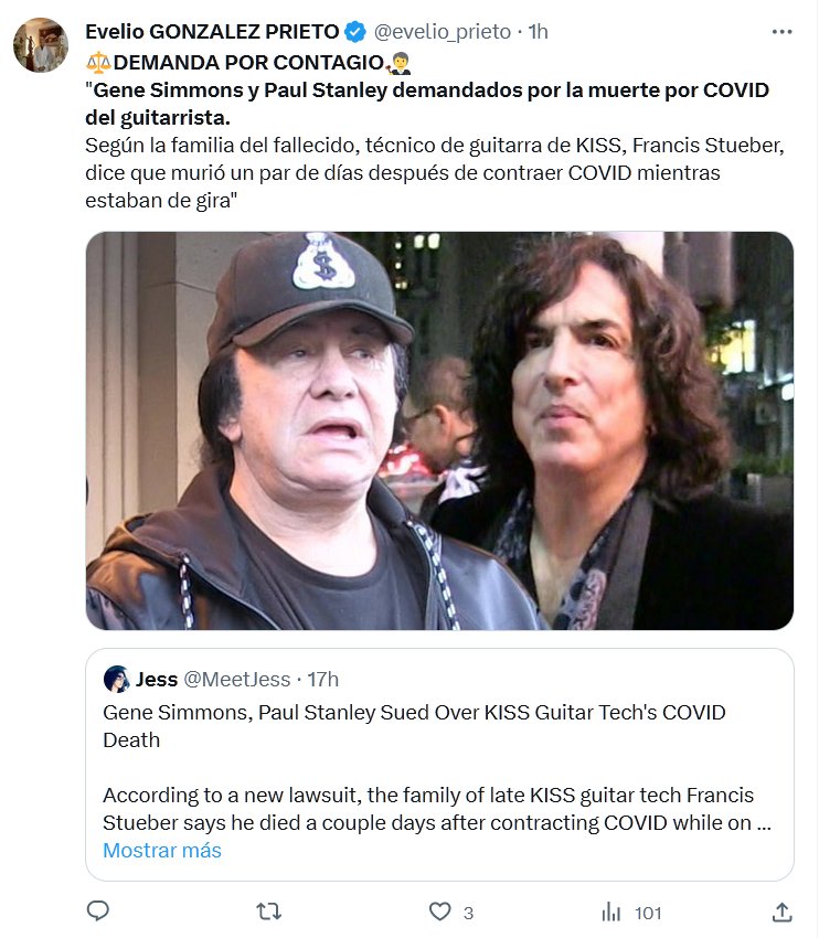 ⚖️DEMANDA POR CONTAGIO🧑⚖️ «Gene Simmons y Paul Stanley demandados por la muerte por COVID del guitarrista. Según la familia del fallecido, técnico de guitarra de KISS, Francis Stueber, dice que murió un par de días después de contraer COVID mientras estaban de gira»