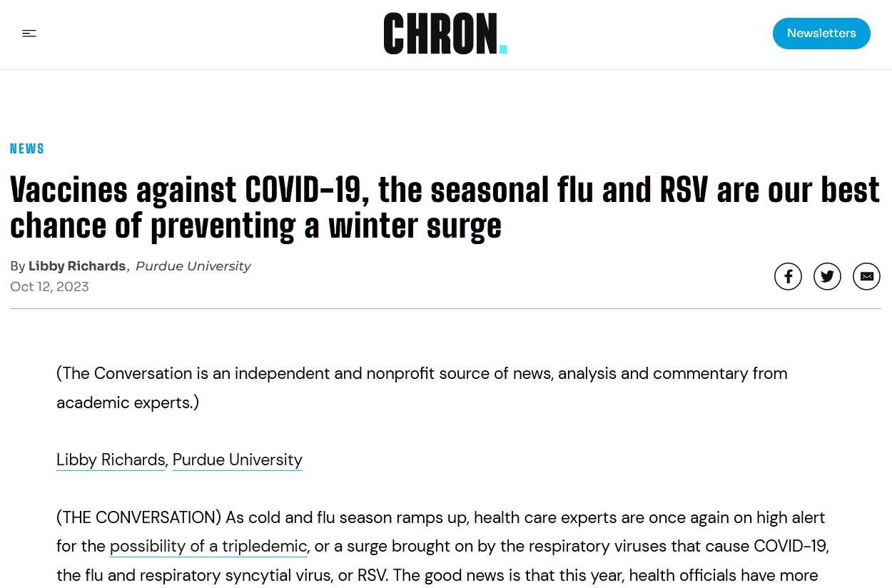 EN INGLÉS Las vacunas contra la COVID-19, la gripe estacional y el VRS son nuestra mejor oportunidad de prevenir un aumento repentino del invierno (O VERANO) Posted on octubre 12, 2023 por coronado https://www.chron.com/news/article/vaccines-against-covid-19-the-seasonal-flu-and-18421581.php