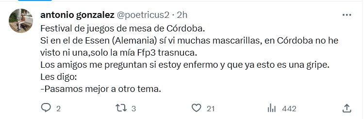 TESTIMONIO ENTRE COVIDIOTAS Festival de juegos de mesa de Córdoba. Si en el de Essen (Alemania) sí vi muchas mascarillas, en Córdoba no he visto ni una,solo la mía Ffp3 trasnuca. Los amigos me preguntan si estoy enfermo y que ya esto es una gripe. Les digo: -Pasamos mejor a otro tema.