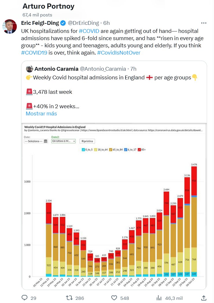 Las hospitalizaciones en el Reino Unido por #COVID se están volviendo a salir de control: las admisiones hospitalarias se han multiplicado por seis desde el verano y **han aumentado en todos los grupos de edad**: niños, jóvenes y adolescentes, adultos jóvenes y ancianos. Si crees que el #COVID19 ha terminado, piénsalo de nuevo. #CovidNoHaTerminado