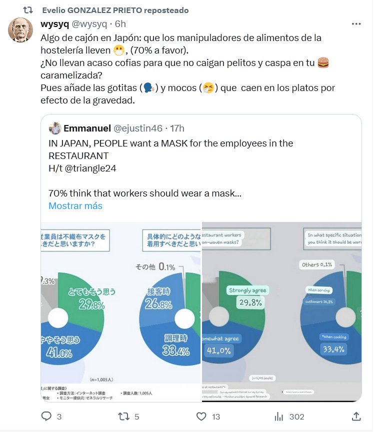 Algo de cajón en Japón: que los manipuladores de alimentos de la hostelería lleven 😷 MASCARILLA, (70% a favor). ¿No llevan acaso cofias para que no caigan pelitos y caspa en tu 🍔 HAMBUERGUESA caramelizada? Pues añade las gotitas (🗣) AEROSOLES y mocos (🤧) que caen en los platos por efecto de la gravedad.