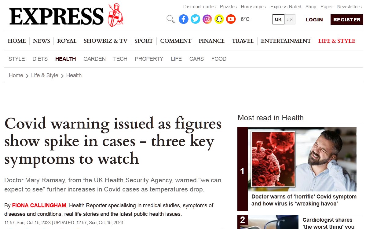 EN INGLÉS Se emite advertencia de Covid cuando las cifras muestran un aumento en los casos: tres síntomas clave a tener en cuenta Posted on octubre 15, 2023 por coronado https://www.express.co.uk/life-style/health/1823965/covid-symptoms-latest-data-spike-cases