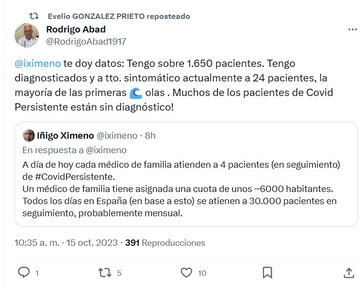 LA ÚNICA VERDAD ES LA REALIDAD! DR. Rodrigo Abad @RodrigoAbad1917 > @iximeno te doy datos: Tengo sobre 1.650 pacientes. Tengo diagnosticados y a tto. (TRATAMIENTO) sintomático actualmente a 24 pacientes, la mayoría de las primeras 🌊 olas . Muchos de los pacientes de Covid Persistente están sin diagnóstico!