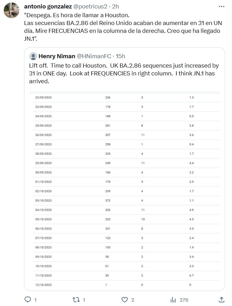 TENEMOS UN PROBLEMA «Despega. Es hora de llamar a Houston. Las secuencias BA.2.86 del Reino Unido acaban de aumentar en 31 en UN día. Mire FRECUENCIAS en la columna de la derecha. Creo que ha llegado JN.1»