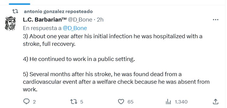 TESTIMONIOS (EN INGLÉS) 3) Aproximadamente un año después de su infección inicial, fue hospitalizado con un derrame cerebral y se recuperó por completo. 4) Continuó trabajando en un entorno público. 5) Varios meses después de su derrame cerebral, fue encontrado muerto por un evento cardiovascular después de un control de bienestar porque estaba ausente del trabajo.