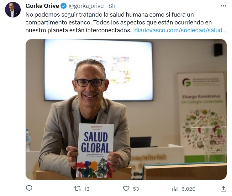 DR. Gorka Orive @gorka_orive · No podemos seguir tratando la salud humana como si fuera un compartimento estanco. Todos los aspectos que están ocurriendo en nuestro planeta están interconectados