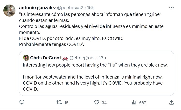 NOCOVID HACE ESTRAGOS «Es interesante cómo las personas ahora informan que tienen “gripe” cuando están enfermas. Controlo las aguas residuales y el nivel de influenza es mínimo en este momento. El de COVID, por otro lado, es muy alto. Es COVID. Probablemente tengas COVID».