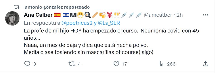 TESTIMONIOS La profe de mi hijo HOY ha empezado el curso. Neumonía covid con 45 años… Naaa, un mes de baja y dice que está hecha polvo. Media clase tosiendo sin mascarillas of course Posted on octubre 16, 2023 por coronado