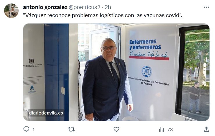 ESPAÑA «Vázquez reconoce problemas logísticos con las vacunas covid» Posted on octubre 17, 2023 por coronado https://www.diariodeavila.es/noticia/z62e2c477-e04e-2ed1-a95da53ce5440f89/202310/vazquez-reconoce-problemas-logisticos-con-las-vacunas-covid
