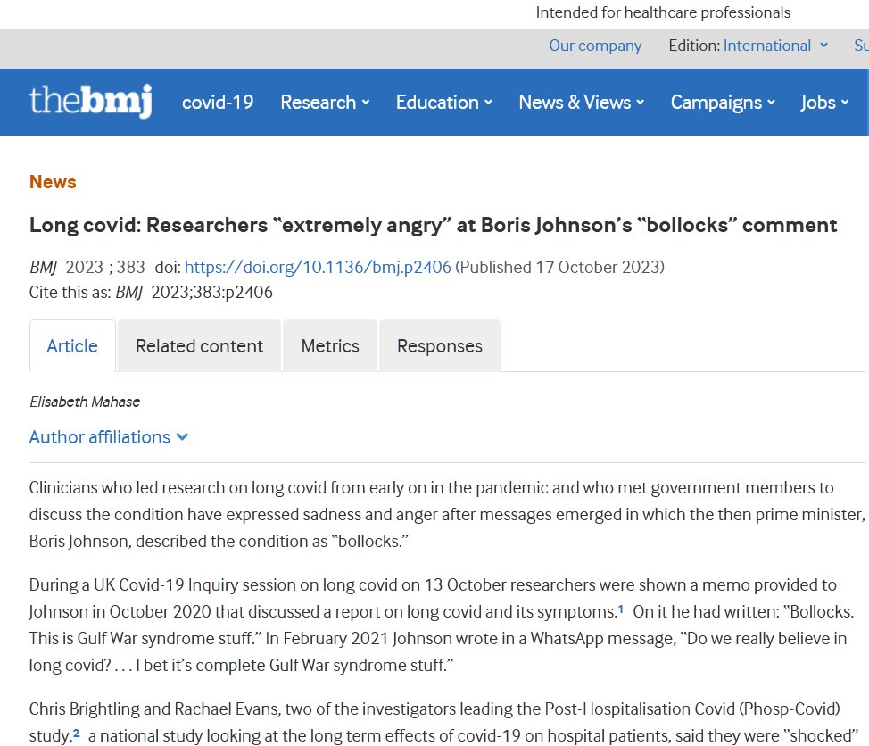 JUICIOS COVID (EN INGLÉS) Covid prolongado: investigadores “extremadamente enojados” por el comentario de “tonterías” de Boris Johnson Posted on octubre 17, 2023 por coronado https://www.bmj.com/content/383/bmj.p2406