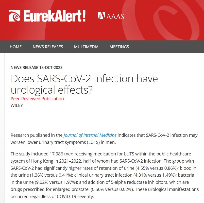 EN INGLÉS ¿La infección por SARS-CoV-2 tiene efectos urológicos? Posted on octubre 18, 2023 por coronado https://www.eurekalert.org/news-releases/1004749