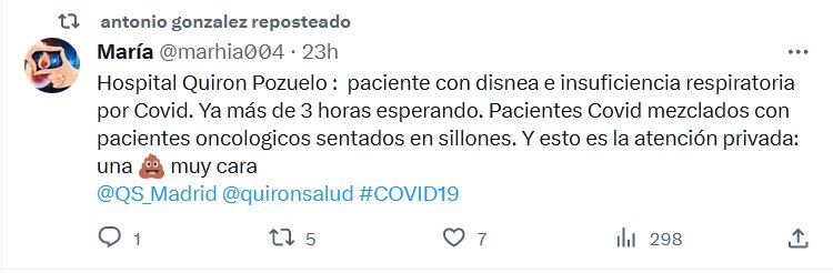PRIVADA=MIERDA CARA (ACÁ, EN EUROPA, O DONDE SEA) Hospital Quiron Pozuelo : paciente con disnea e insuficiencia respiratoria por Covid. Ya más de 3 horas esperando. Pacientes Covid mezclados con pacientes oncologicos sentados en sillones. Y esto es la atención privada: una 💩 muy cara