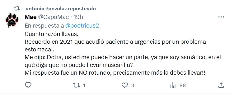 TESTIMONIOS Recuerdo en 2021 que acudió paciente a urgencias por un problema estomacal. Me dijo: Dctra, usted me puede hacer un parte, ya que soy asmático, en el qué diga que no puedo llevar mascarilla? Mi respuesta fue un NO rotundo, precisamente más la debes llevar!!
