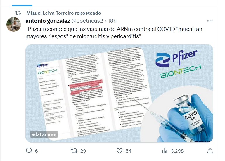 ARNm…ierda! TRAS LOS HECHOS CONSUMADOS «Pfizer reconoce que las vacunas de ARNm contra el COV1D «muestran mayores riesgos» de miocarditis y pericarditis». Posted on octubre 19, 2023 por coronado https://www.edatv.news/noticias/50641/pfizer-reconoce-que-las-vacunas-de-arnm-contra-el-covid-muestran-mayores-riesgos-de-miocarditis-y-pericarditis