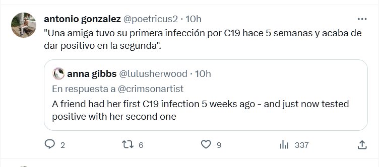 TESTIMONIOS «Una amiga tuvo su primera infección por C19 hace 5 semanas y acaba de dar positivo en la segunda» Posted on octubre 19, 2023 por coronado