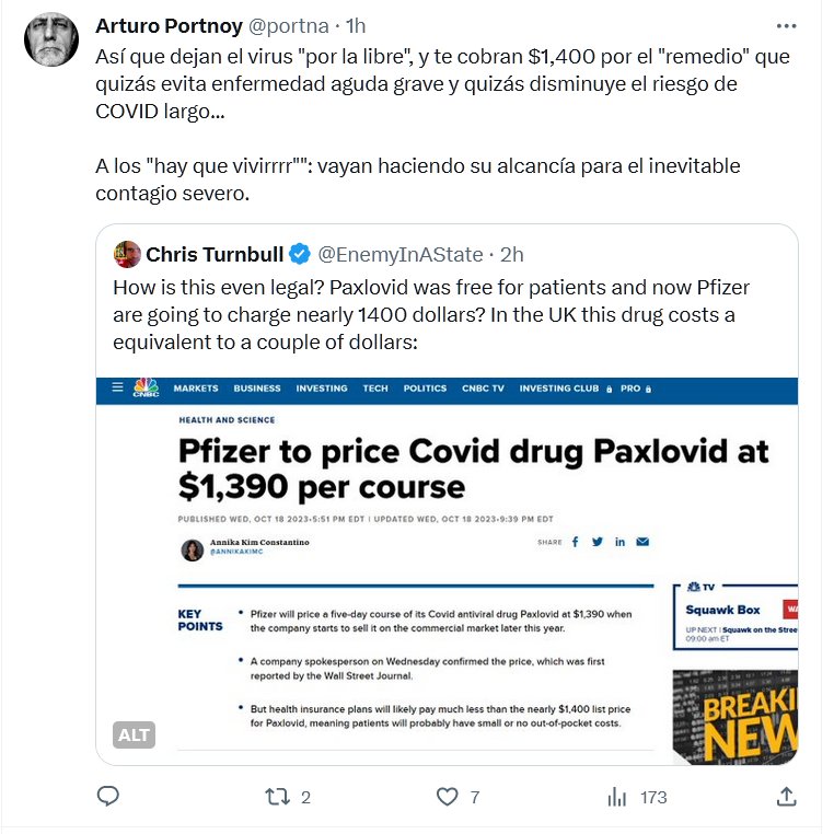 REPANDEMIA=RENEGOCIO Así que dejan el virus «por la libre», y te cobran $1,400 por el «remedio» que quizás evita enfermedad aguda grave y quizás disminuye el riesgo de COVID largo… A los «hay que vivirrrr»»: vayan haciendo su alcancía para el inevitable contagio severo.